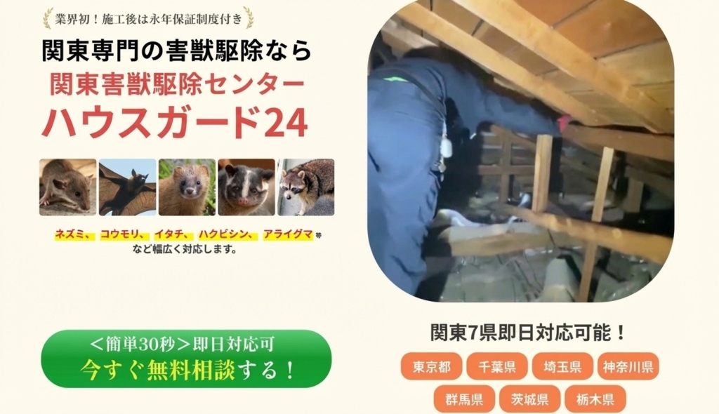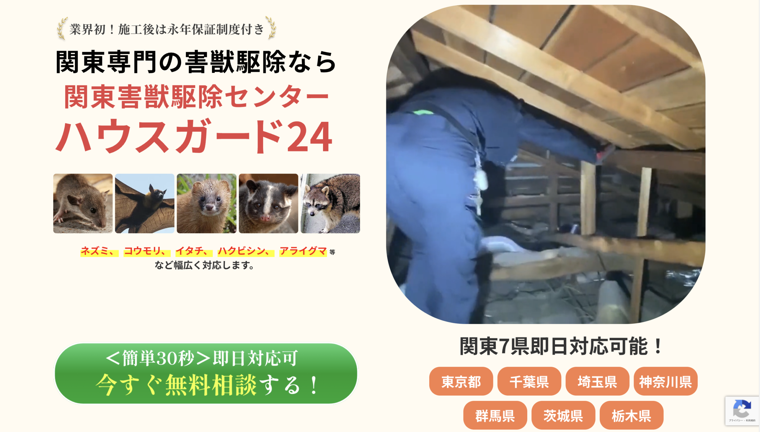 | サービス名 | 関東害獣駆除センター ハウスガード24 | 街角害獣駆除相談所 | 害獣駆除専門【ムシプロテック】 |